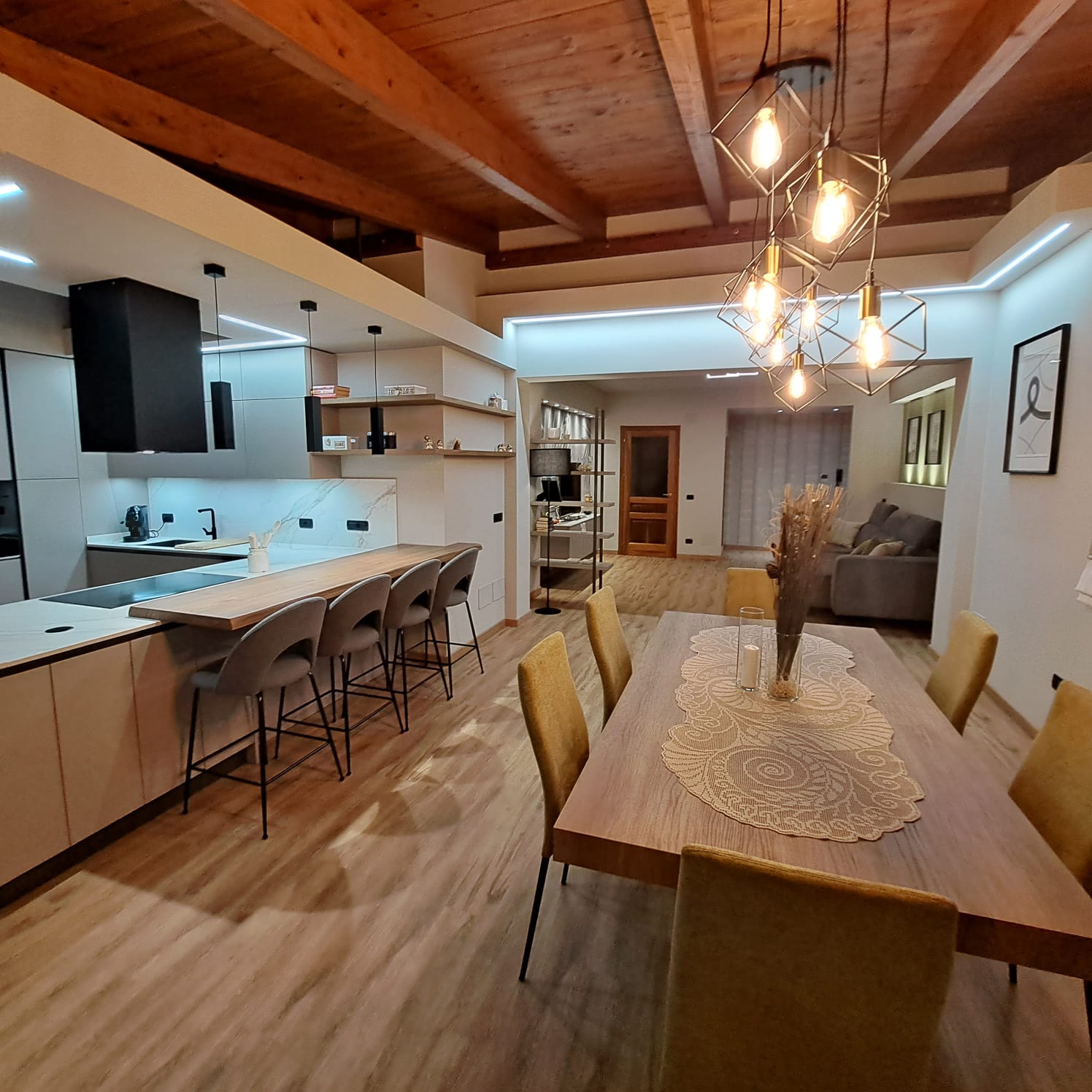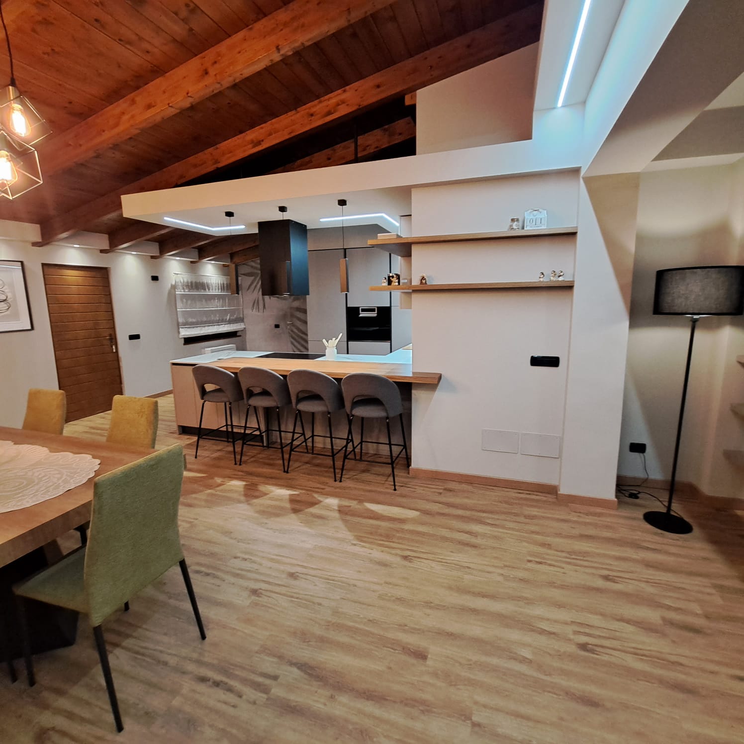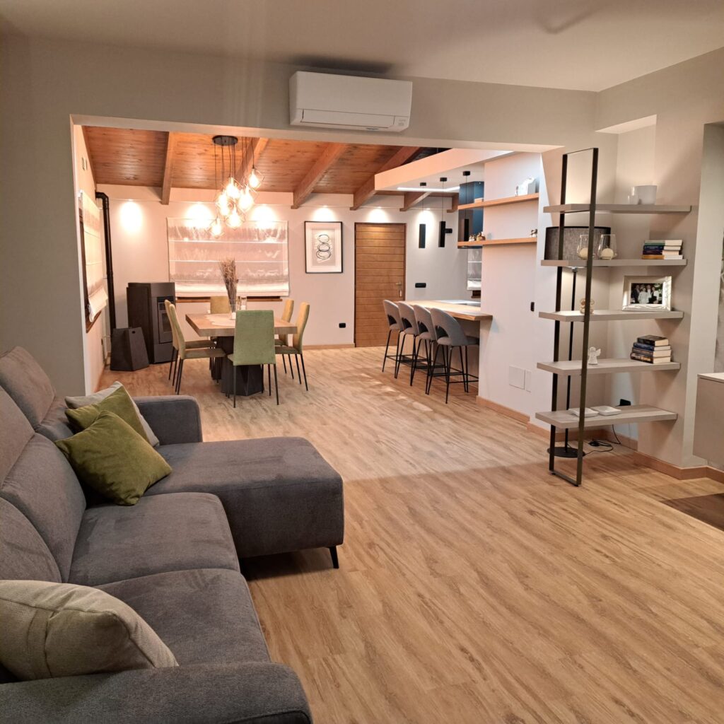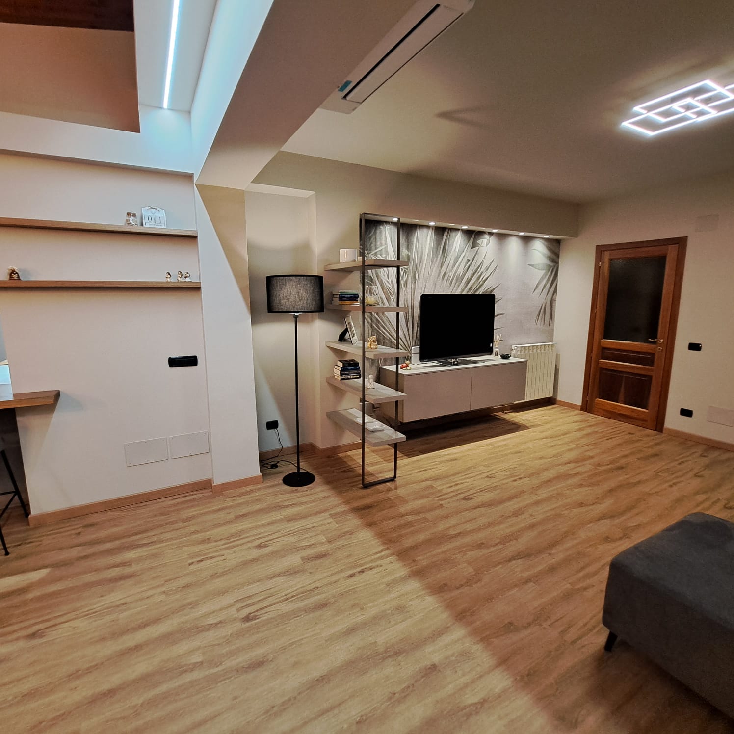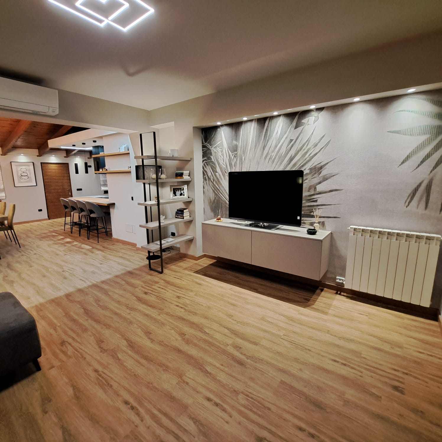 Progetto che nasce dall’esigenza dei clienti di avere un open space importante nelle dimensioni; è bastato abbattere una parete per ottenere una superfice grande, nella quale siamo riusciti a inserire tre aree distinte: area cucina, area pranzo e area living relax. In uno stile leggero e contemporaneo, con colori tenui e con solo l’inserimento di carte da parati a dare importanza alla parete TV e alla parete con porta a scomparsa.