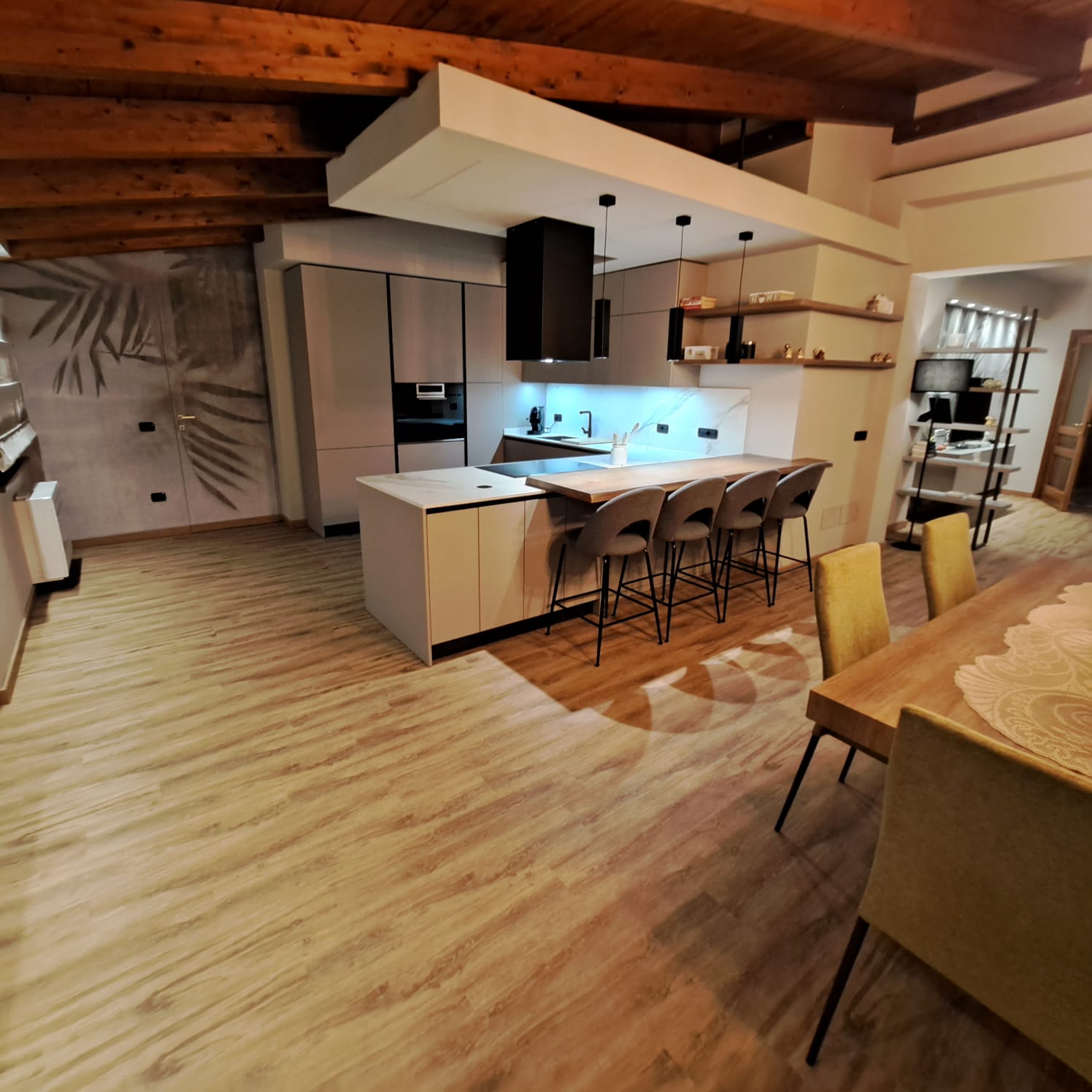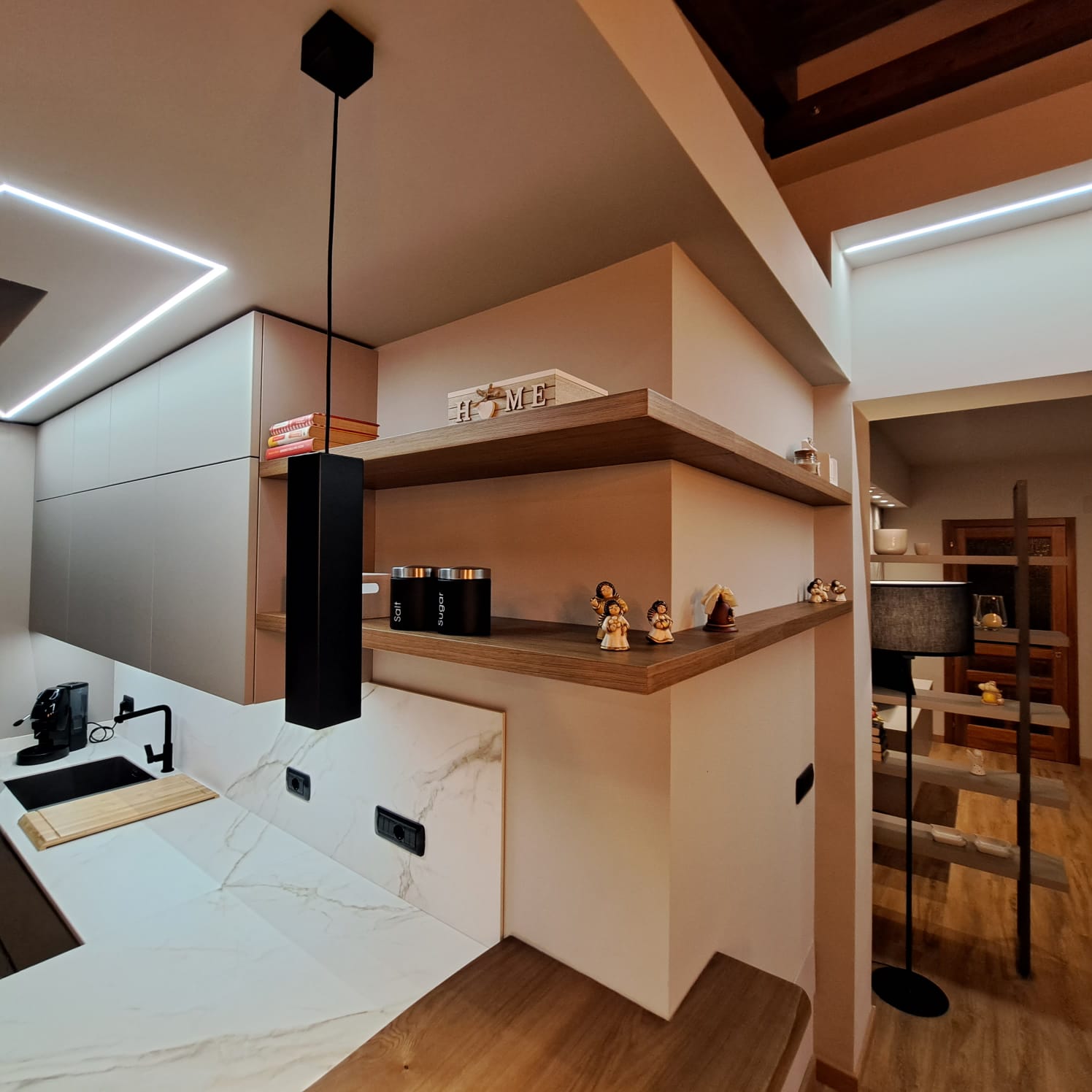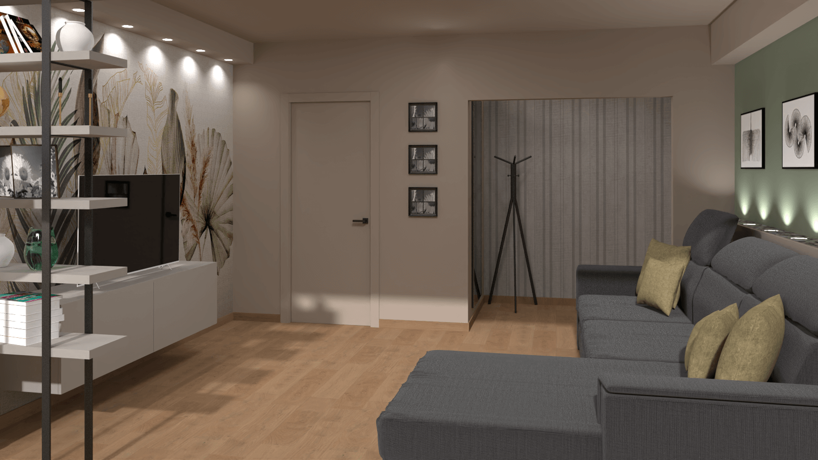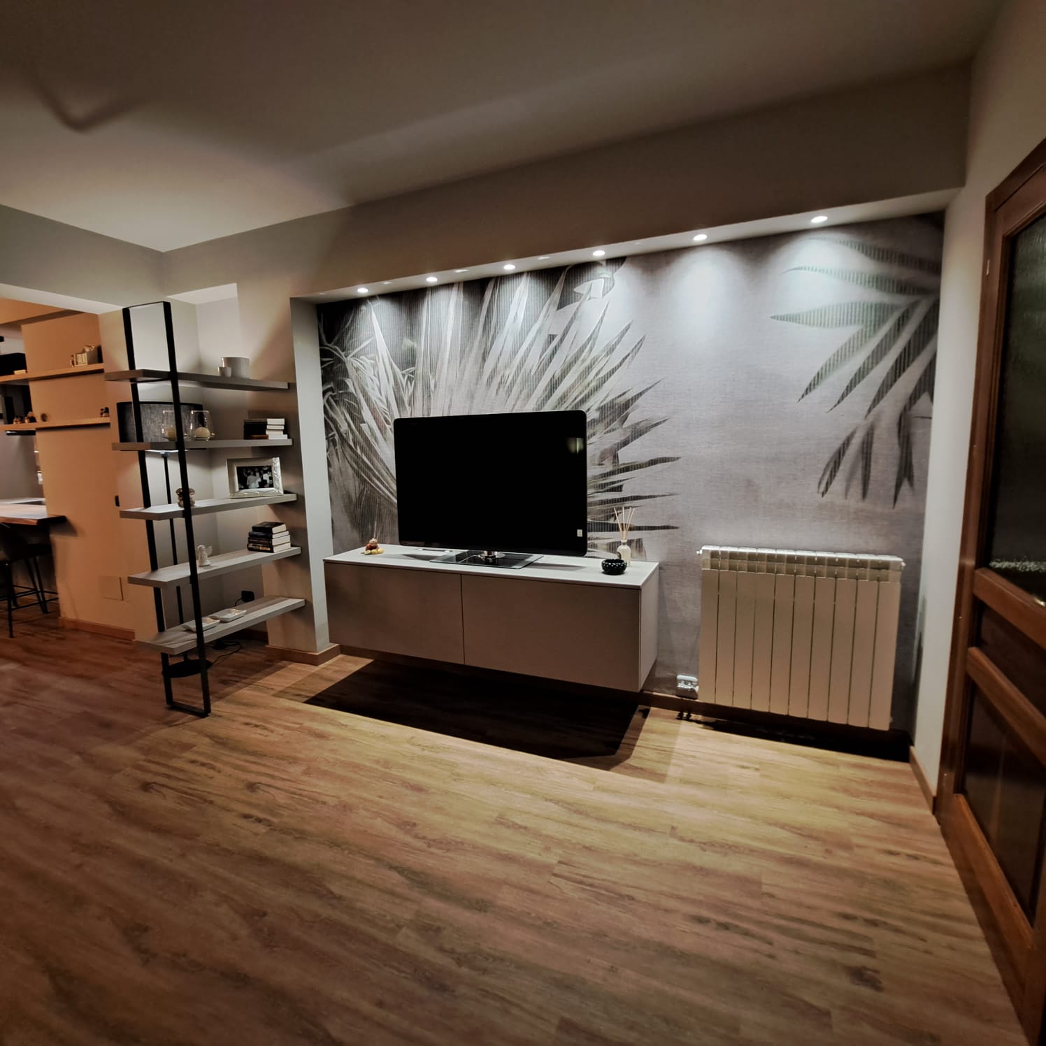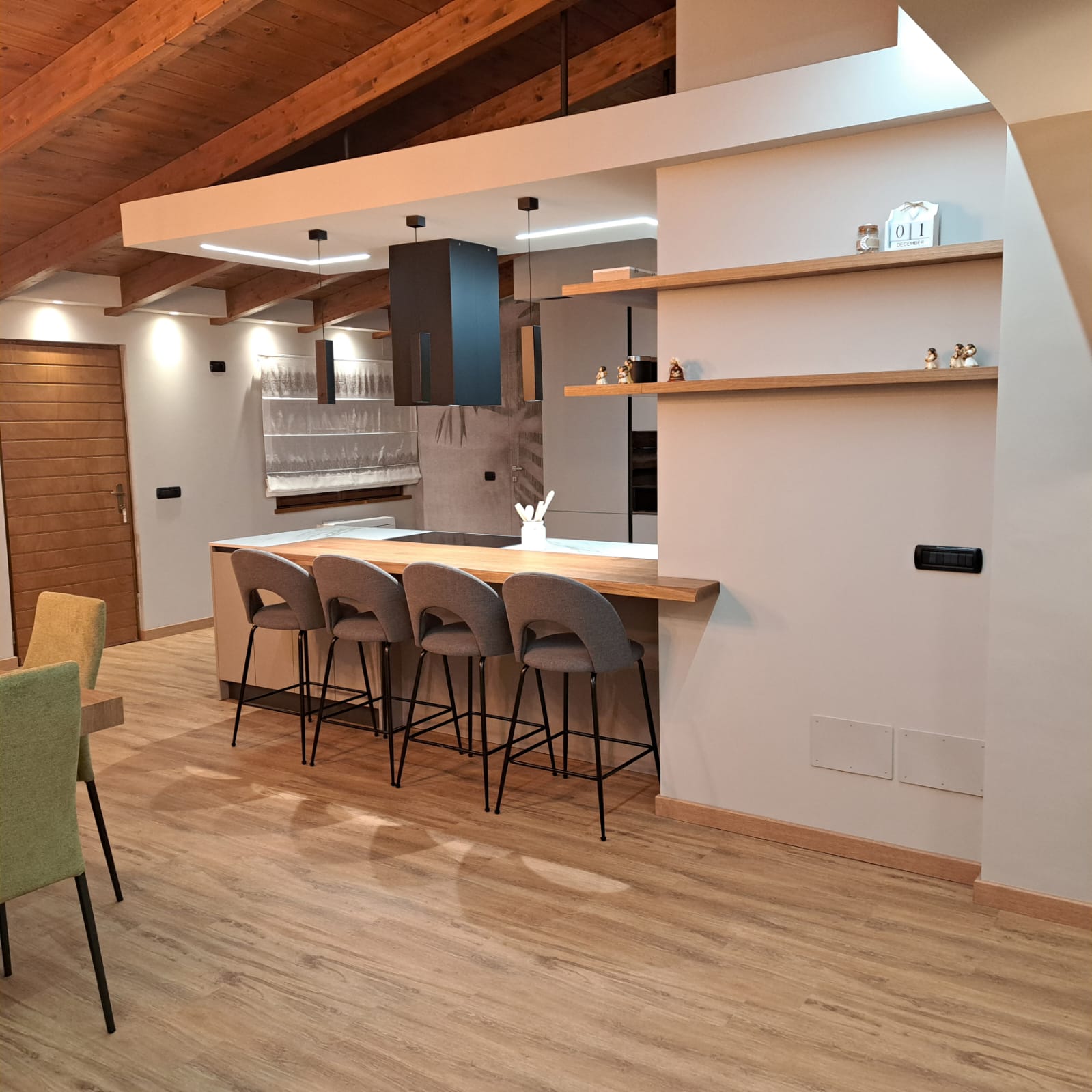 Progetto che nasce dall’esigenza dei clienti di avere un open space importante nelle dimensioni; è bastato abbattere una parete per ottenere una superfice grande, nella quale siamo riusciti a inserire tre aree distinte: area cucina, area pranzo e area living relax. In uno stile leggero e contemporaneo, con colori tenui e con solo l’inserimento di carte da parati a dare importanza alla parete TV e alla parete con porta a scomparsa.