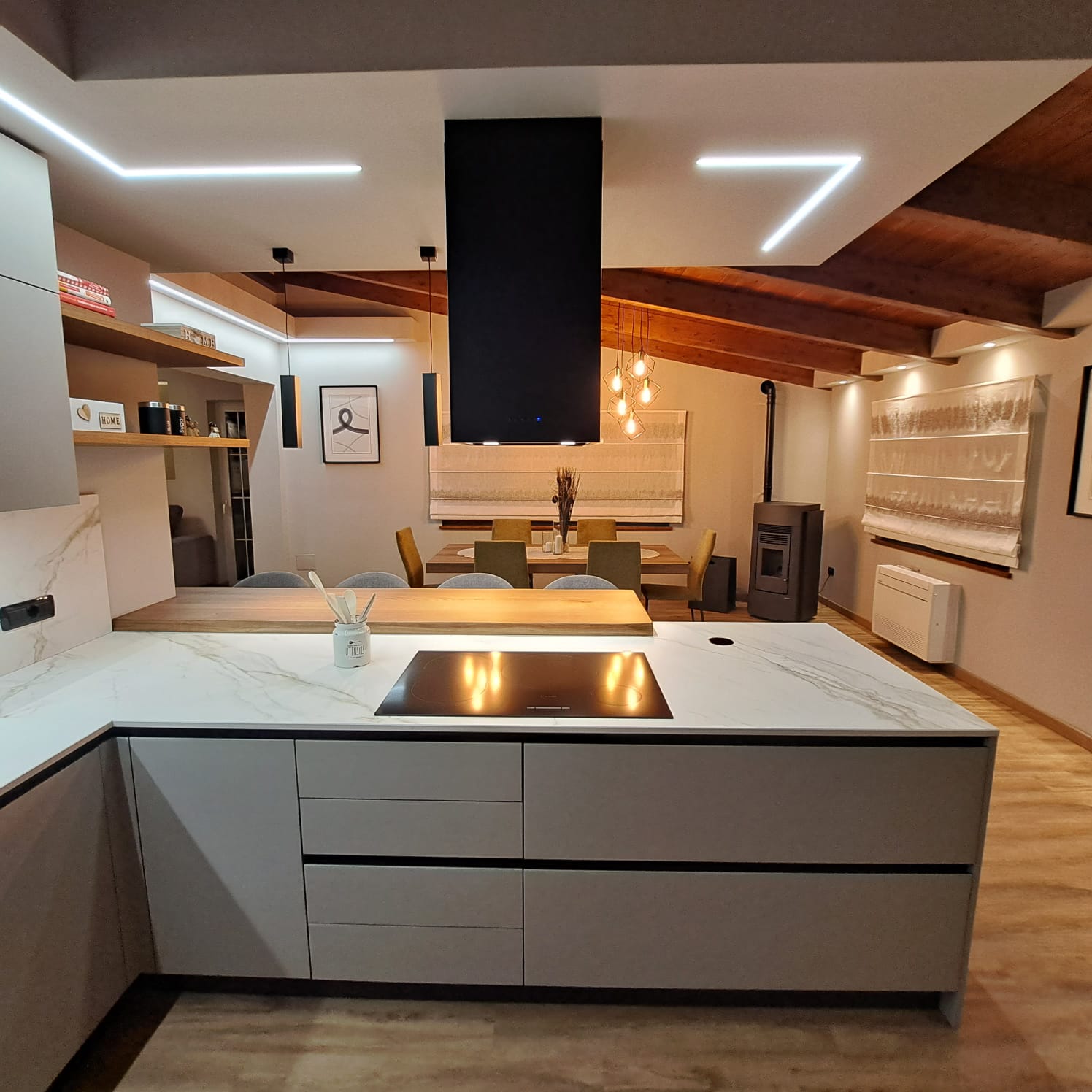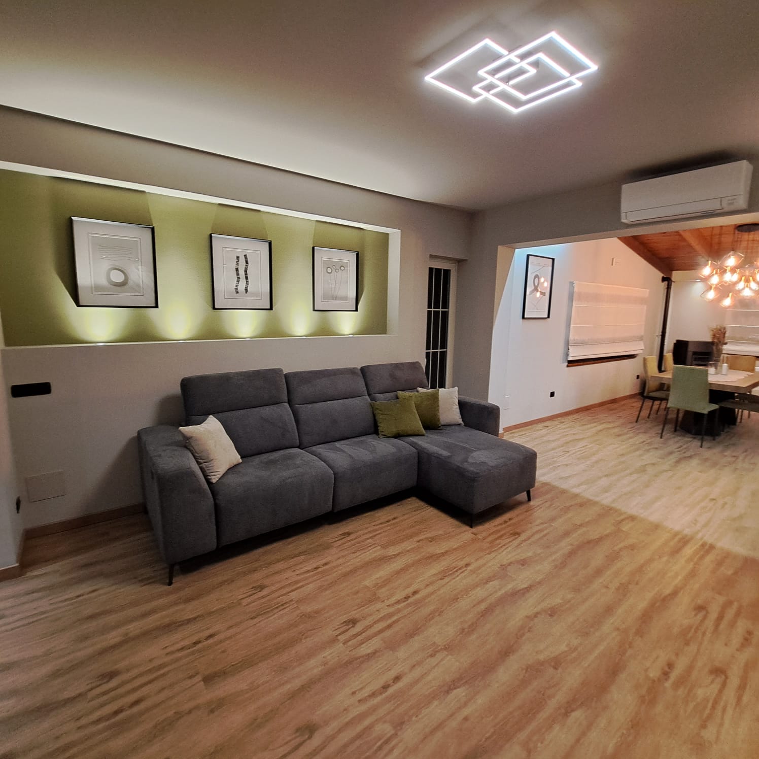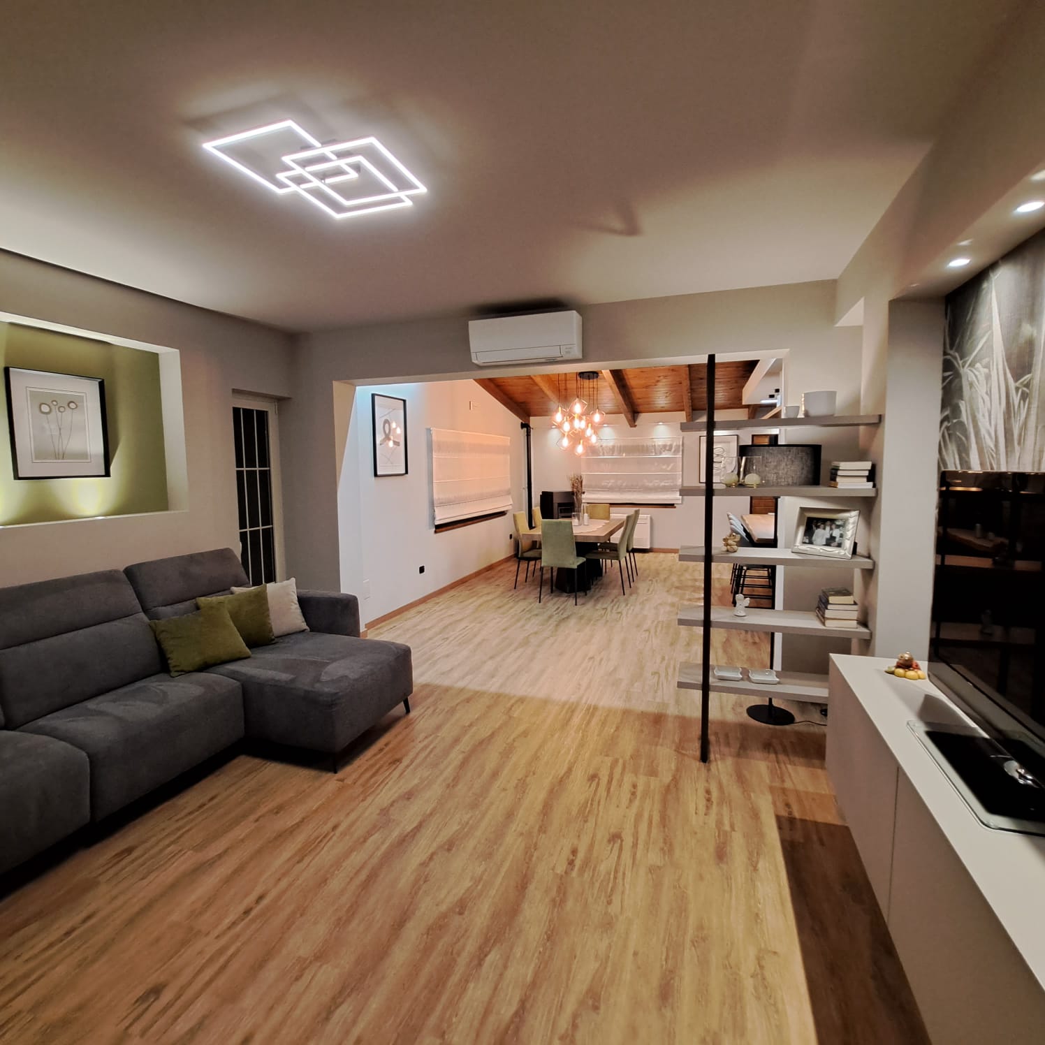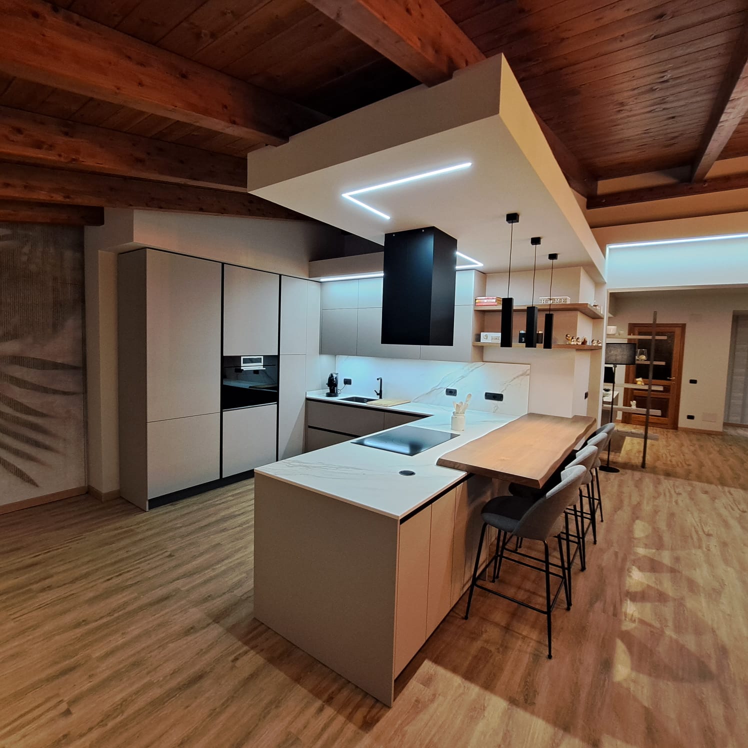 Progetto che nasce dall’esigenza dei clienti di avere un open space importante nelle dimensioni; è bastato abbattere una parete per ottenere una superfice grande, nella quale siamo riusciti a inserire tre aree distinte: area cucina, area pranzo e area living relax. In uno stile leggero e contemporaneo, con colori tenui e con solo l’inserimento di carte da parati a dare importanza alla parete TV e alla parete con porta a scomparsa.