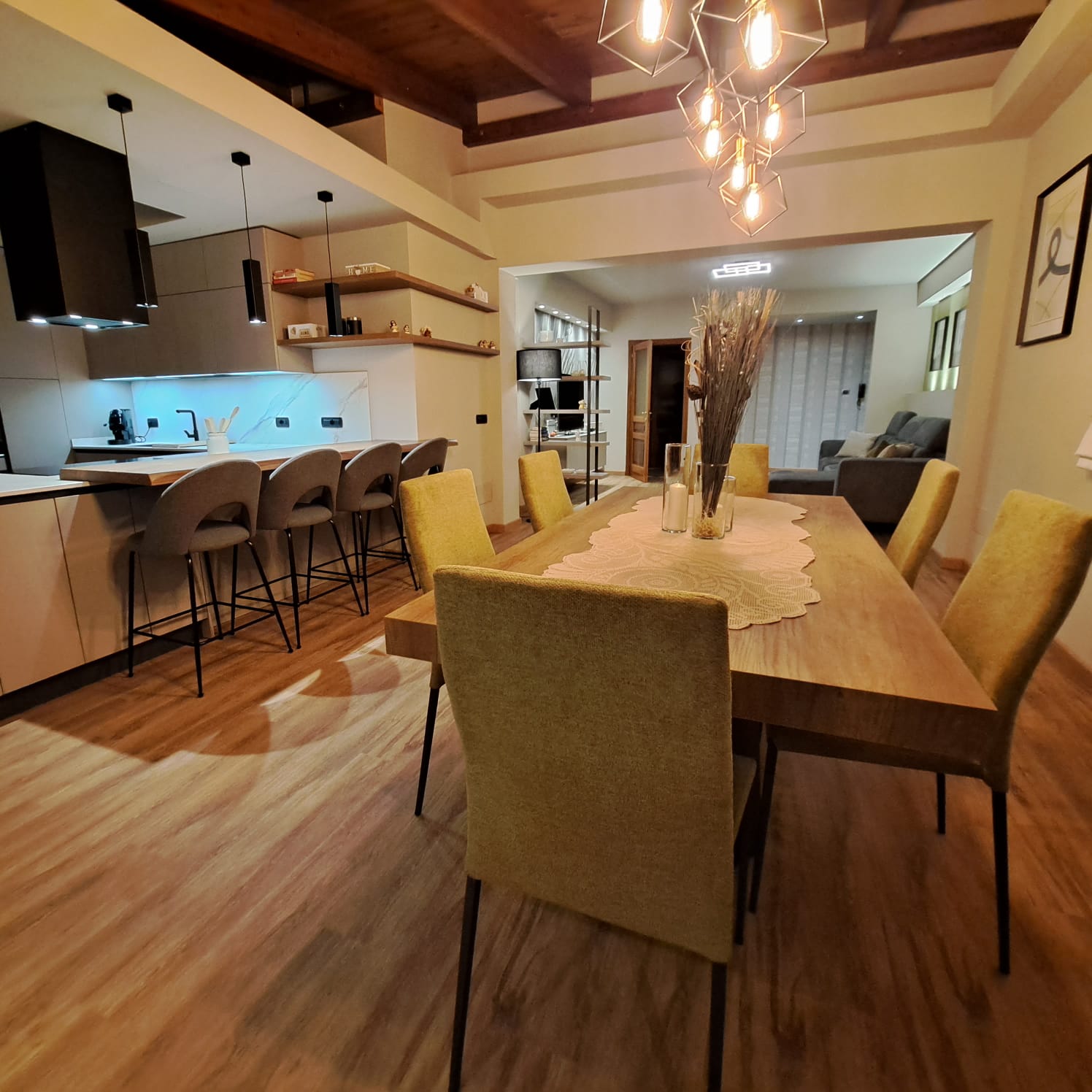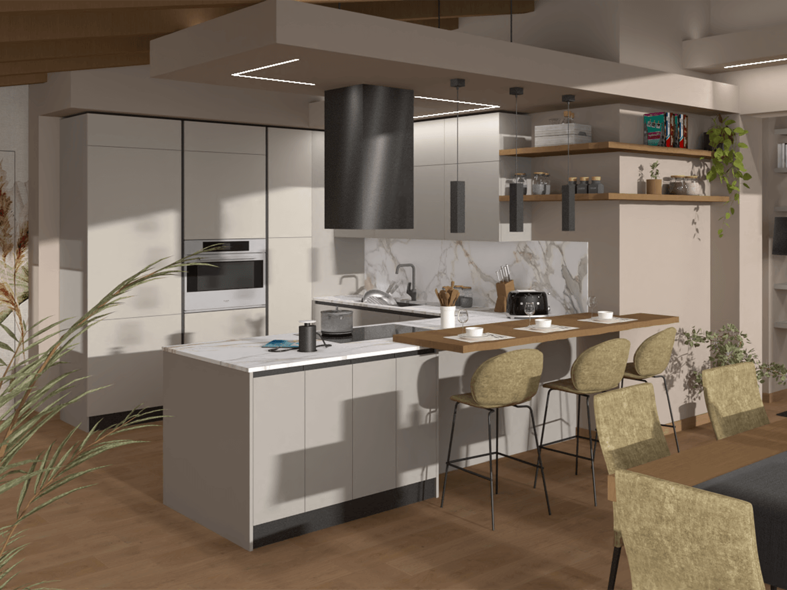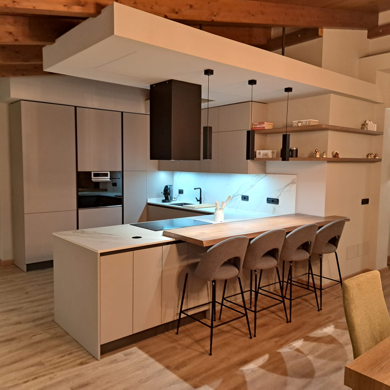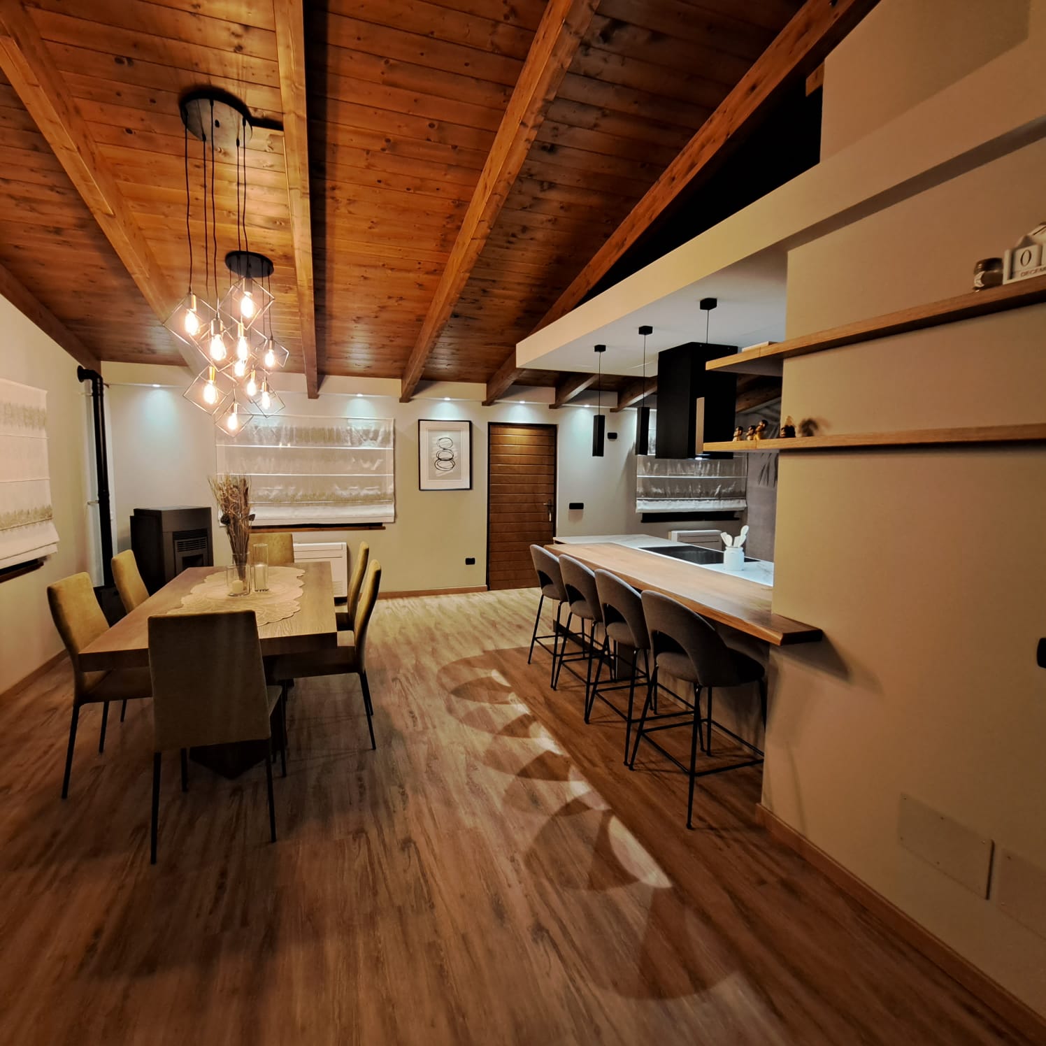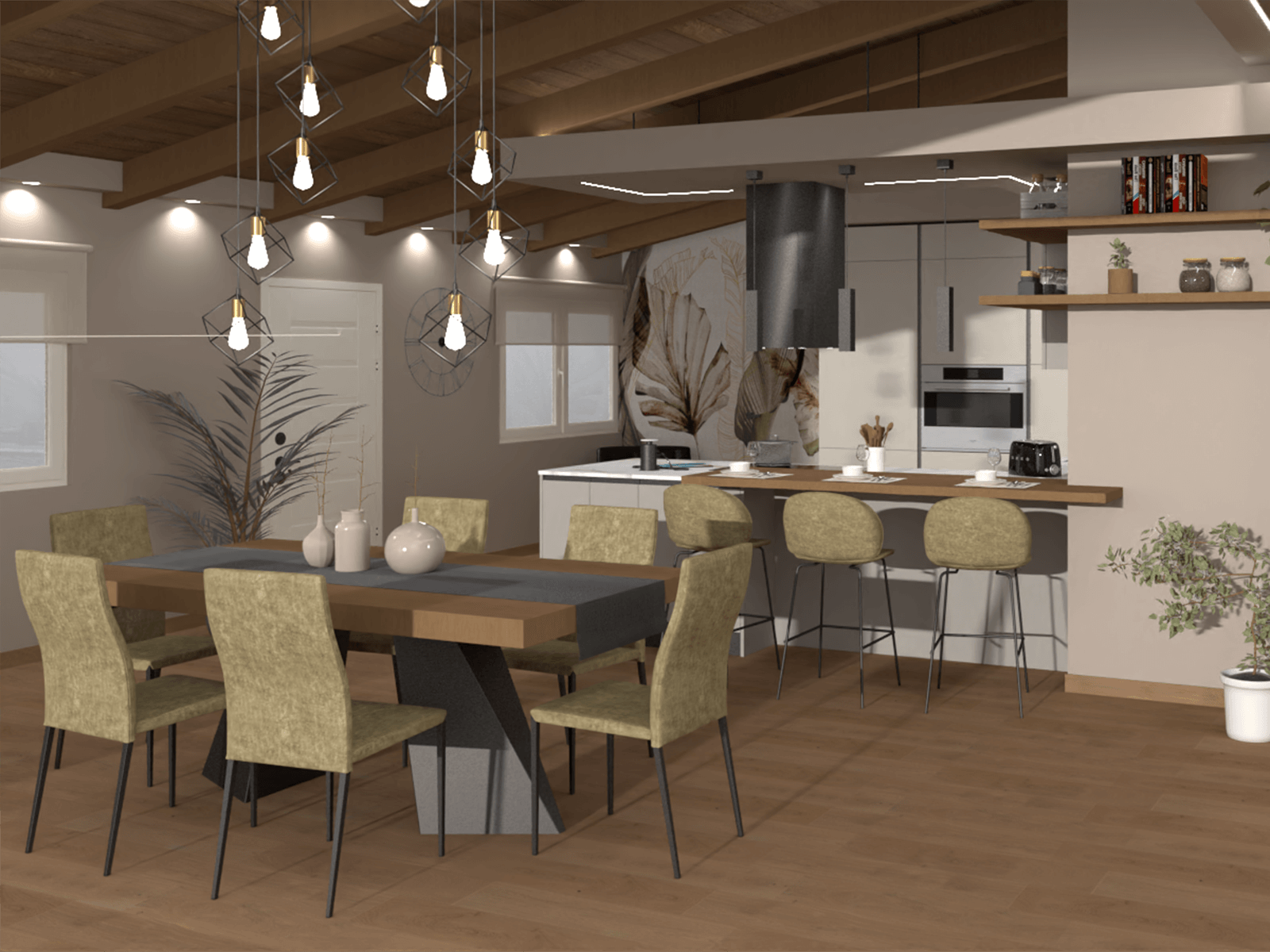 Progetto che nasce dall’esigenza dei clienti di avere un open space importante nelle dimensioni; è bastato abbattere una parete per ottenere una superfice grande, nella quale siamo riusciti a inserire tre aree distinte: area cucina, area pranzo e area living relax. In uno stile leggero e contemporaneo, con colori tenui e con solo l’inserimento di carte da parati a dare importanza alla parete TV e alla parete con porta a scomparsa.