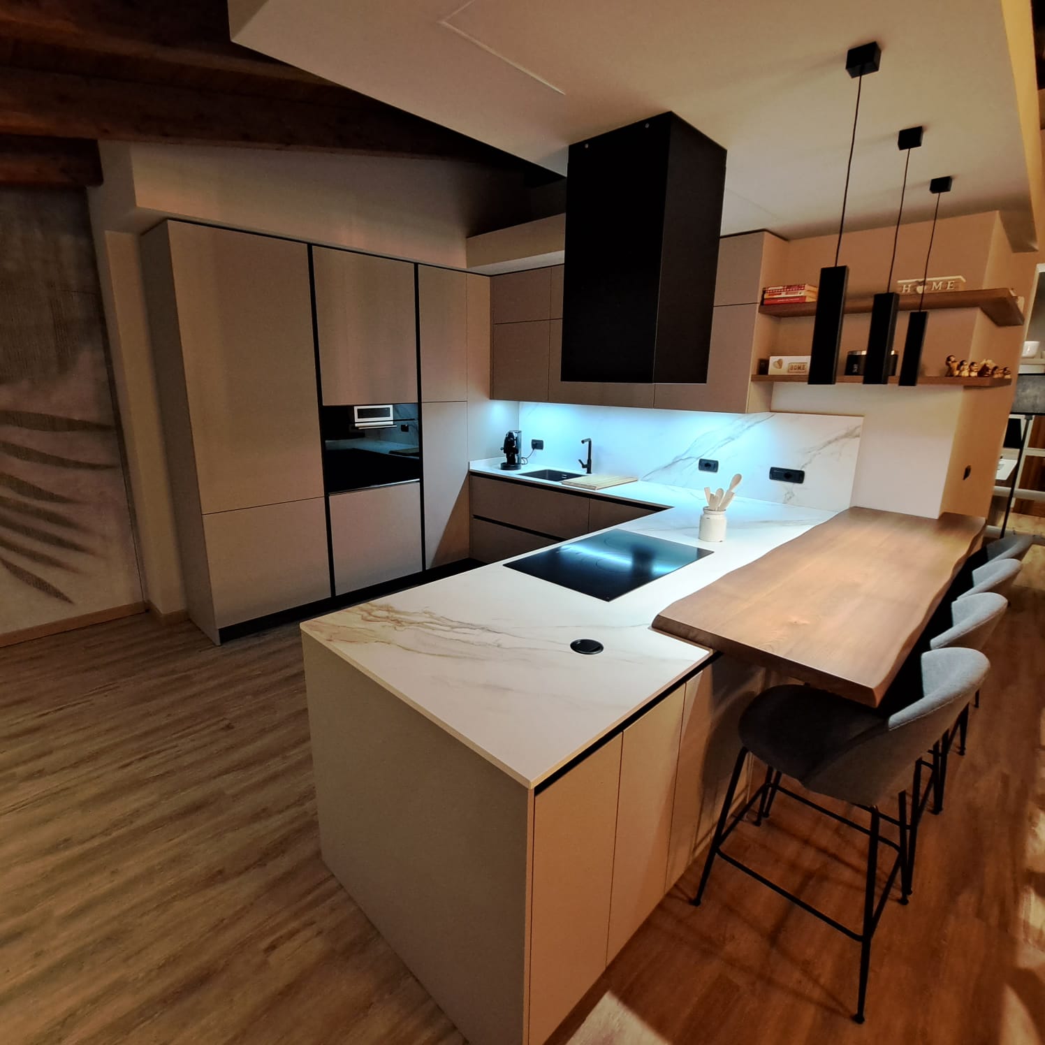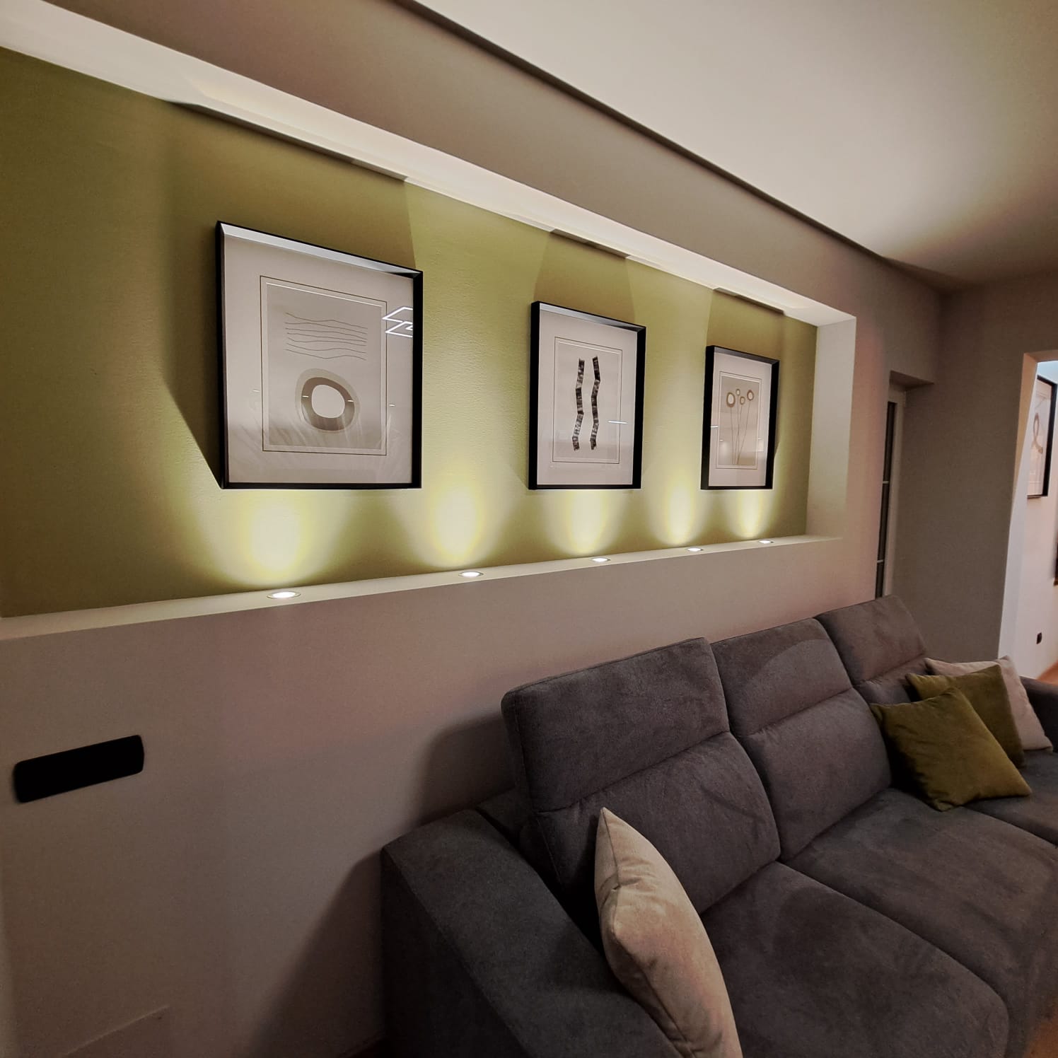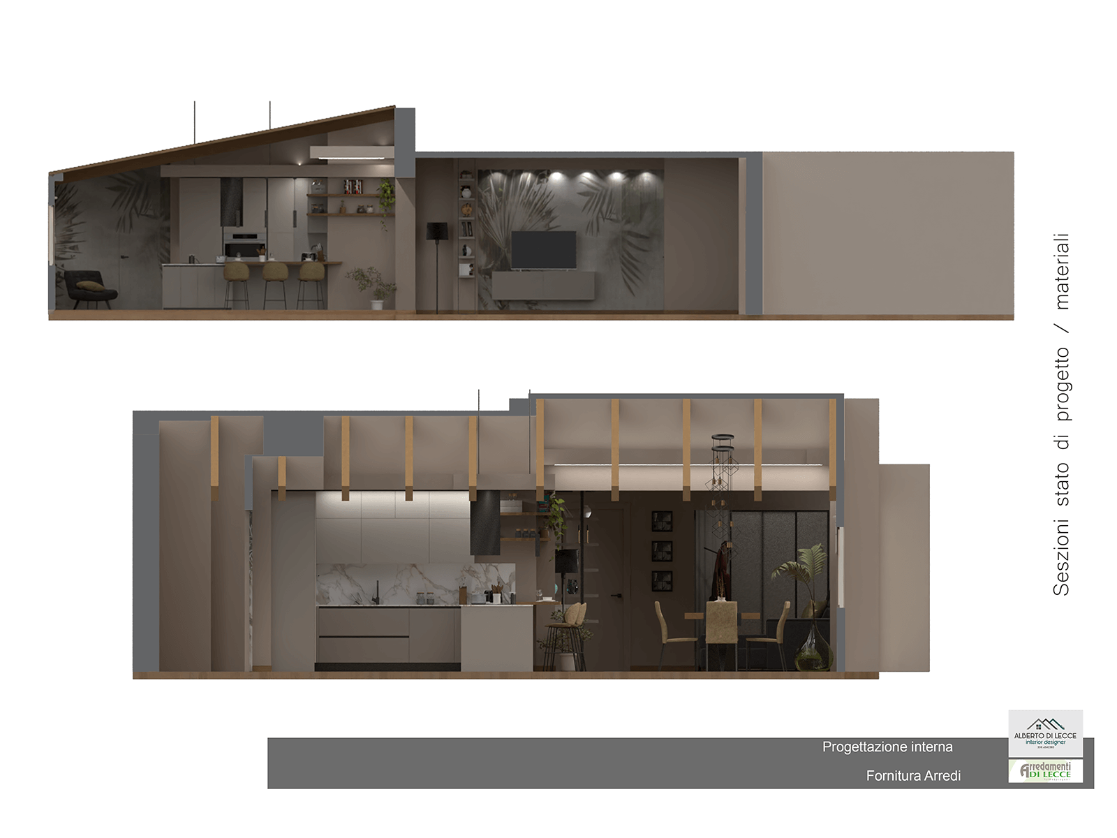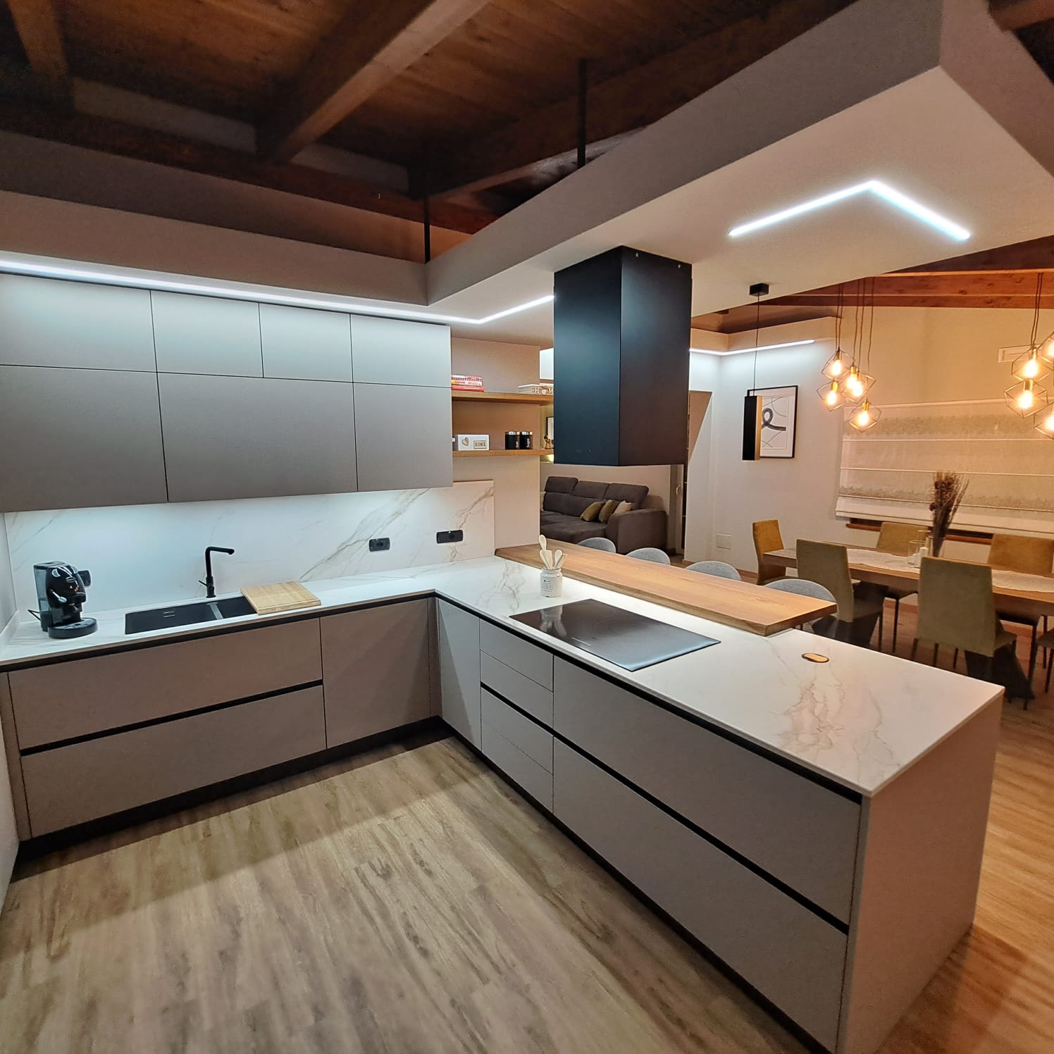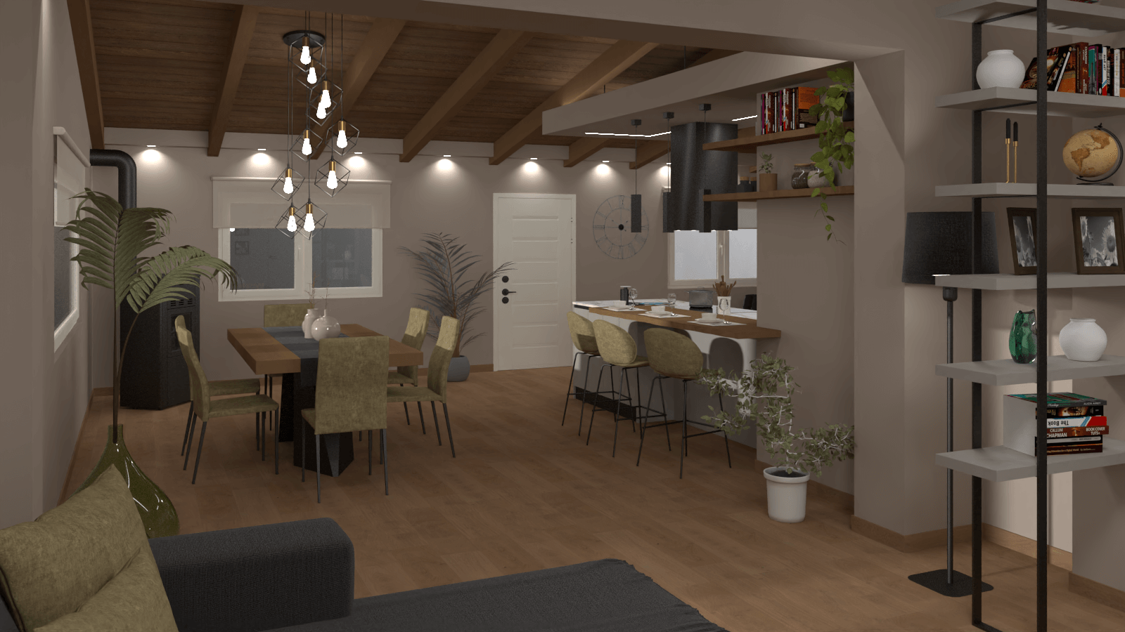 Progetto che nasce dall’esigenza dei clienti di avere un open space importante nelle dimensioni; è bastato abbattere una parete per ottenere una superfice grande, nella quale siamo riusciti a inserire tre aree distinte: area cucina, area pranzo e area living relax. In uno stile leggero e contemporaneo, con colori tenui e con solo l’inserimento di carte da parati a dare importanza alla parete TV e alla parete con porta a scomparsa.