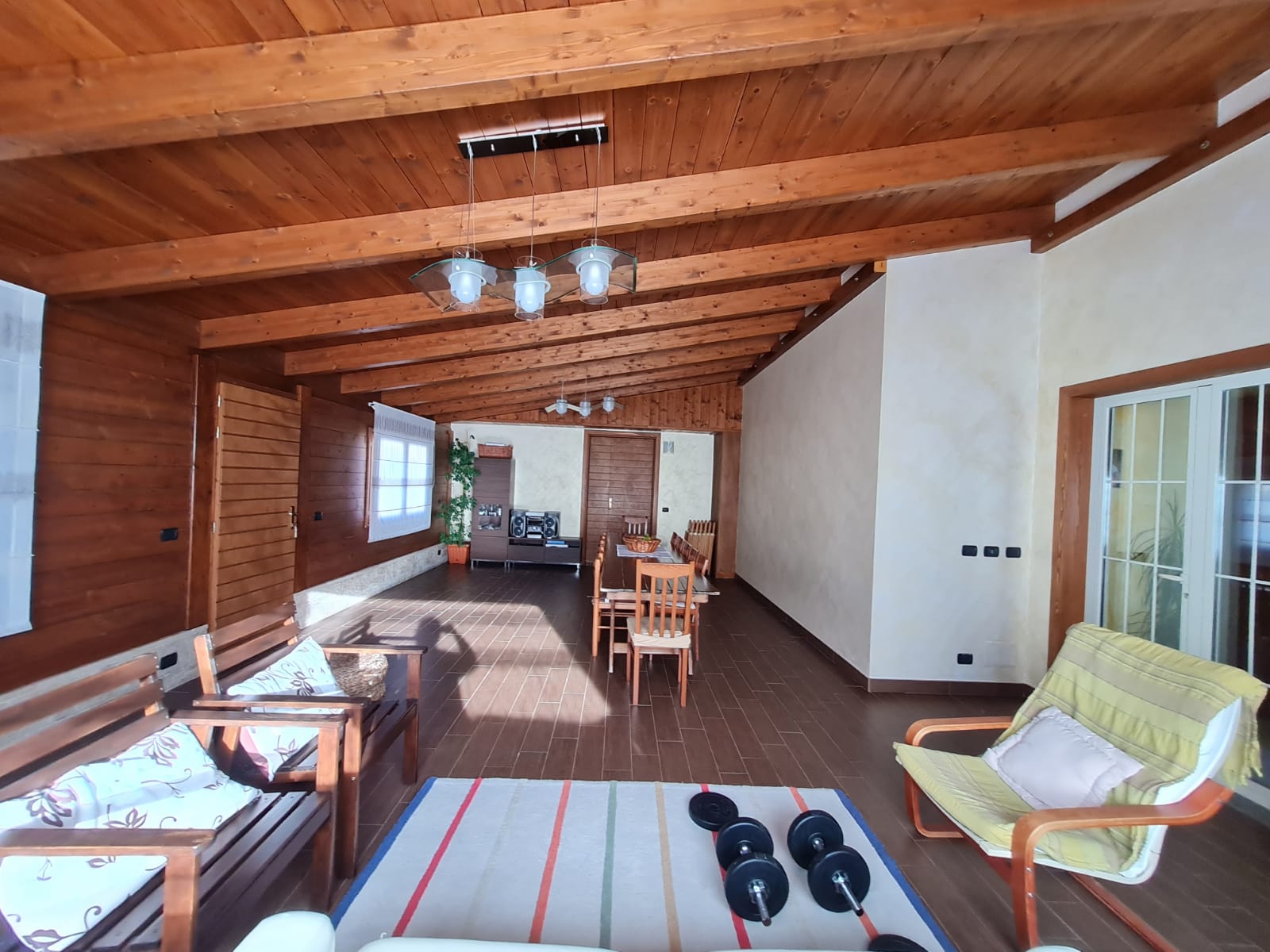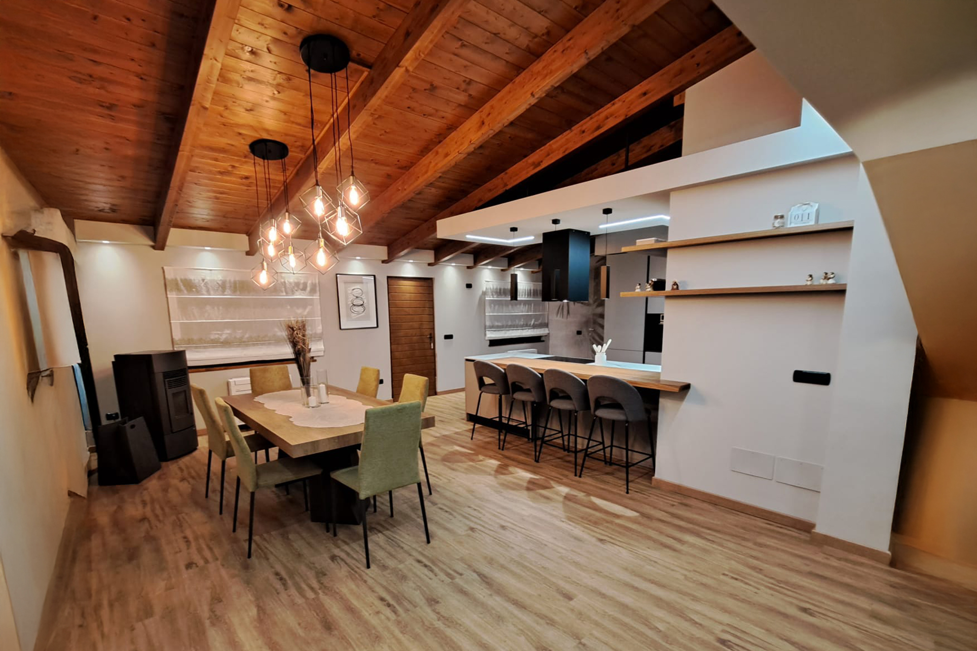 Caratteristica del progetto sono l’assoluta linearità e la sospensione del cartongesso, che non compromette l’estetica del tetto in legno